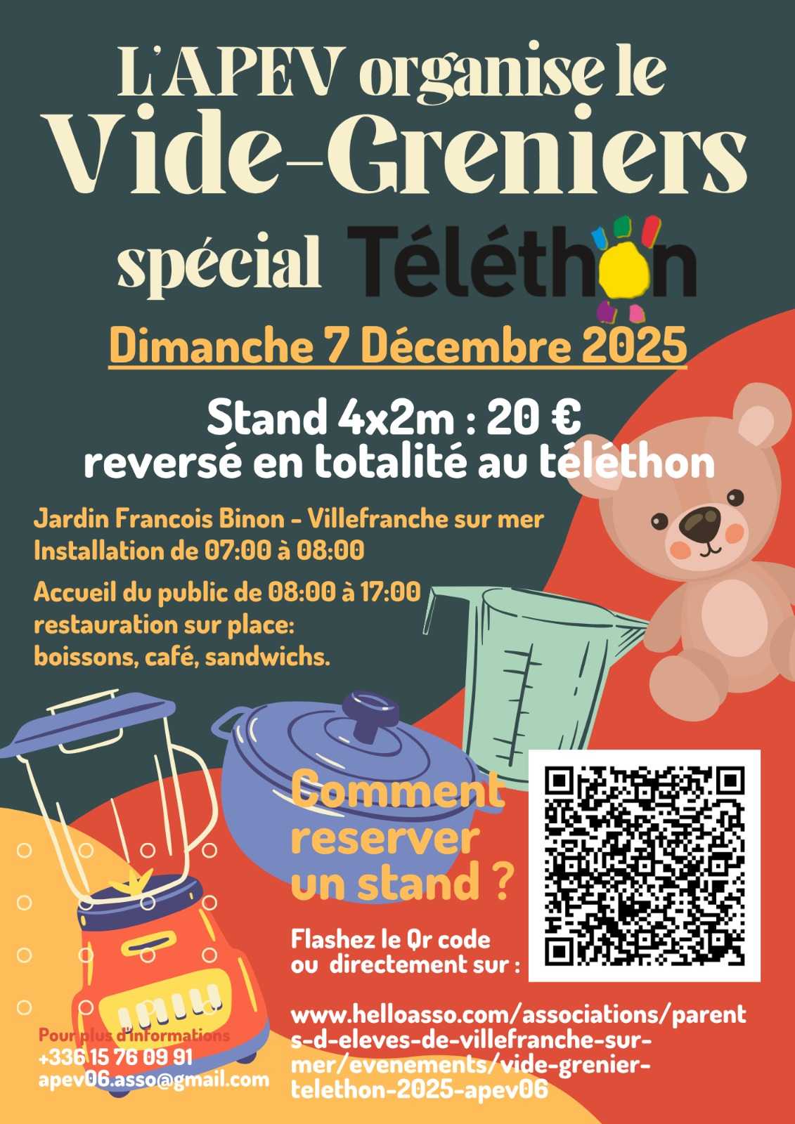 Stand de 4x2m = 20 € Inscription sur HELLOASSO : https://www.helloasso.com/associations/parents-d-eleves-de-villefranche-sur-mer/evenements/vide-grenier-telethon-2025-apev06