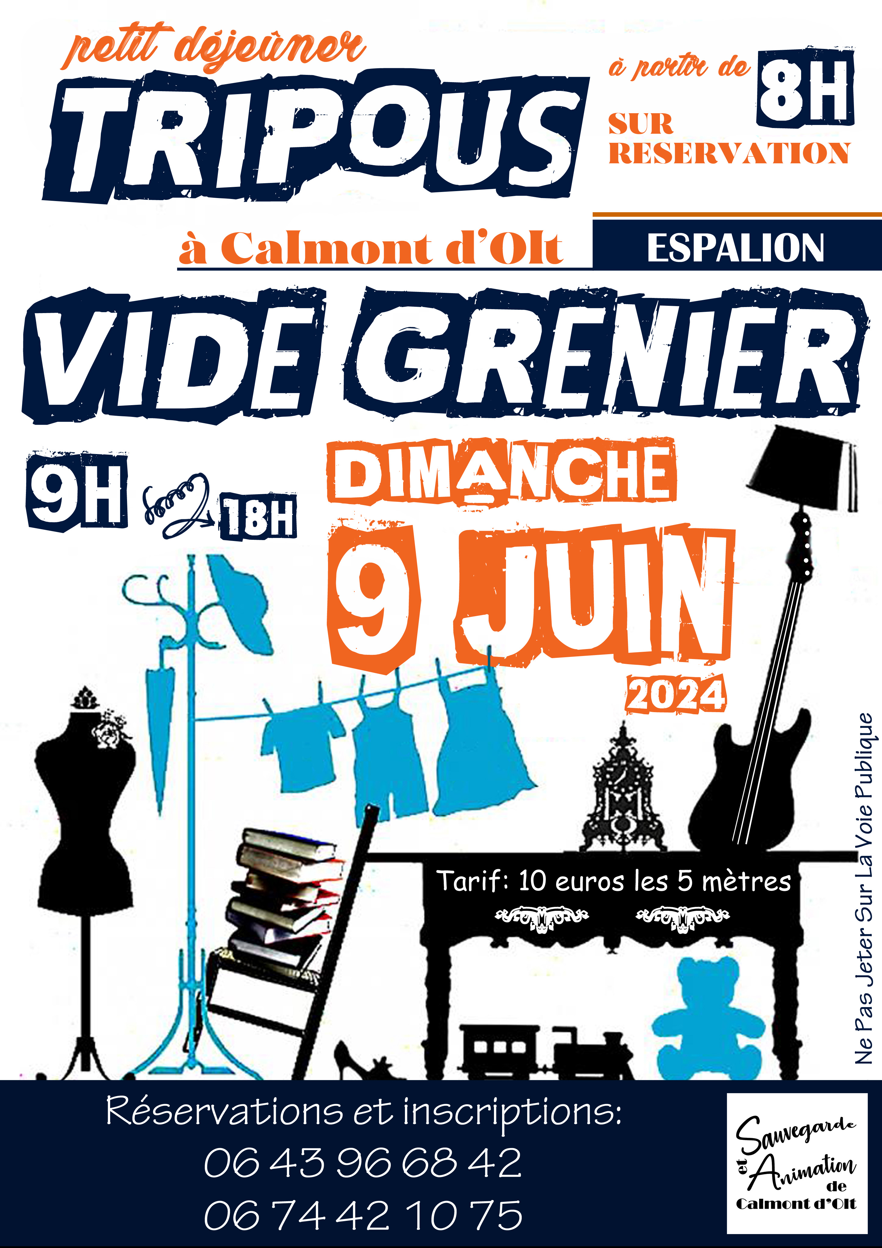 Vide-grenier organisé par l Association Animation et Sauvegarde de Calmont d'Olt Exposant particulier Tarif 10 euros les 5 mètres
