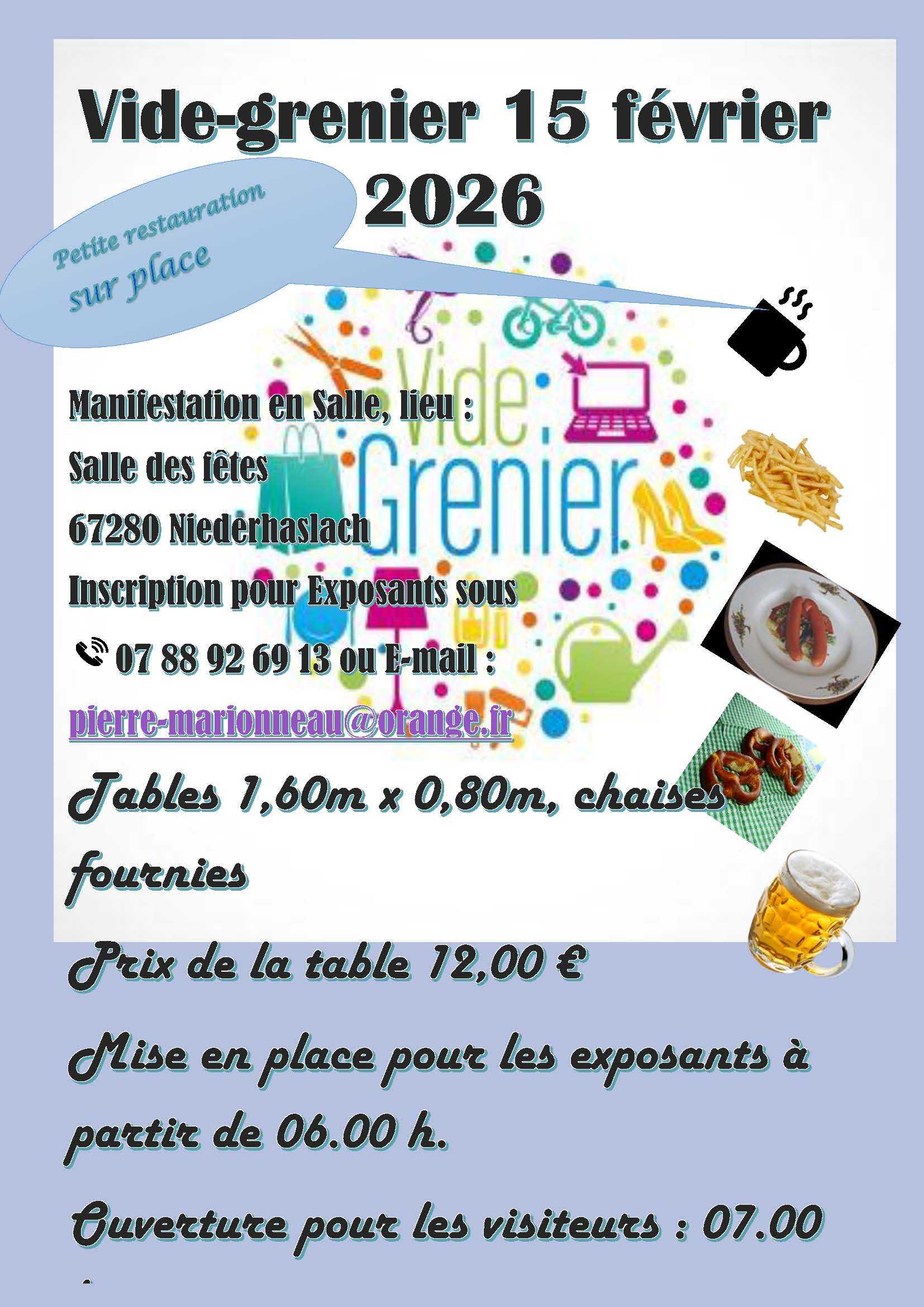 Vide-grenier en salle. Réservation par table 1,80mx0,80m, pas par m2, pour les exposants = nombre de m2: 55 tables Prix du m2: 12,00€/table