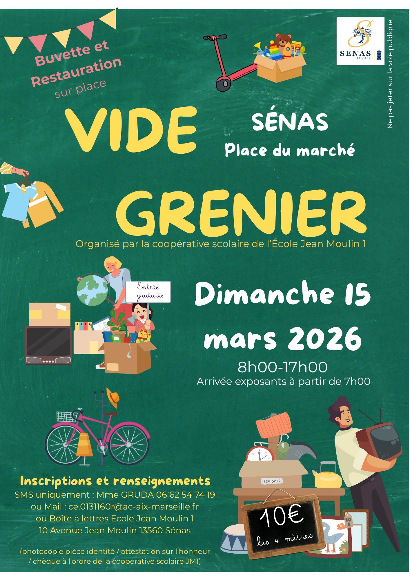 * Buvette et restauration sur place * Tarif exposants : 10 euros les 4 mètres * Pièces à fournir : photocopie de la pièce d'identité, attestation sur l'honneur, règlement par chèque à l'ordre de la coopérative scolaire JM1 * Inscriptions et renseignements : Voir l'affiche