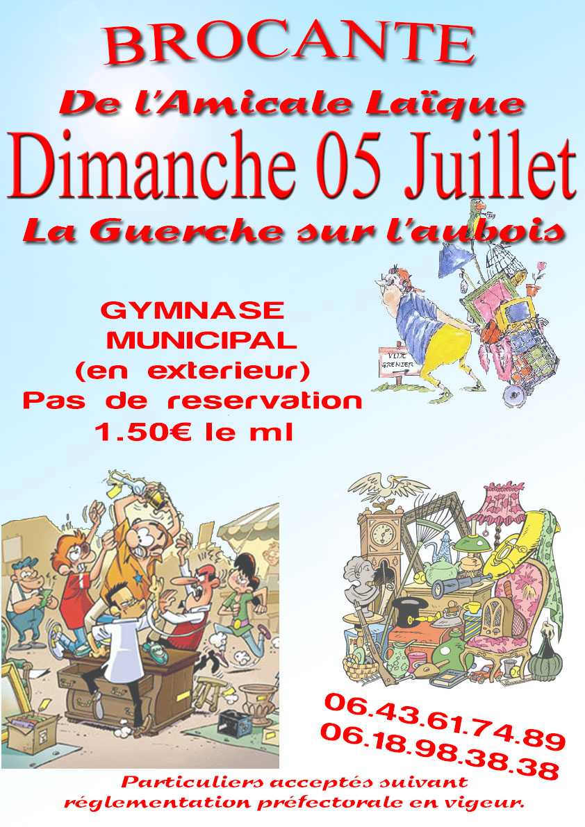 Bonjour, l'Amicale Laique la Guerche Handball organise, sa brocante le dimanche 05 Juillet. L’accueil des exposants débute à 6H. PAS DE RESERVATION Le tarif au mètre linéaire est de 1.50 euros pour les exposants . EXPOSANTS ALIMENTAIRE INTERDITS Entrée gratuite pour les visiteurs. Les exposants peuvent garer leur véhicule sur leur emplacement Pour tous renseignements, appelez au 0643617489 où 0618983838, par mail 5418010@ffhandball.net ou sur Messenger. Nous vous attendons nombreux