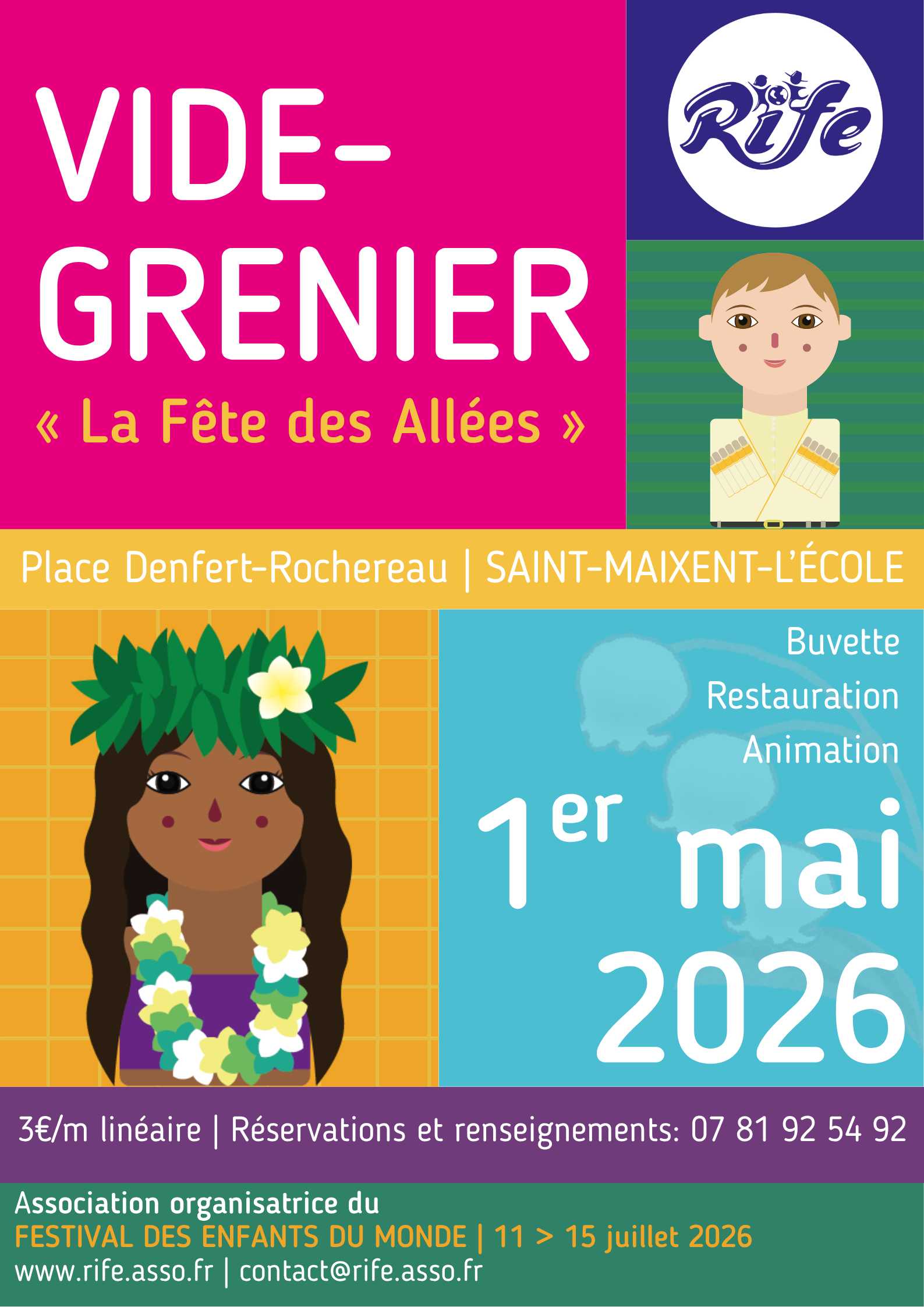 Vendredi 01 Mai 2026 Saint-Maixent-l'École (79400) Vide-greniers - 8è année De 08h00 à 19h00 - Extérieur, Toilettes, Accès handicapés, Animations, Buvette, Restauration sur place, Exposants en alimentaire refusés 3€ le mètre linéaire Association des RIFE - 07 81 92 54 92 Place denfert Rochereau - A partir de 6h - jeudi 01 mai 2025 De 08h00 à 19h00 (Sur place il y aura : buvette / restauration / animations 3€ le mètre linéaire)