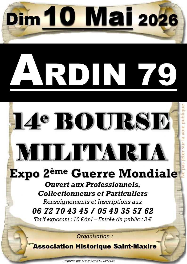 Venez acheter ou échanger toute la journée des antiquités militaires, des armes anciennes ou de chasse. Mais aussi uniformes, insignes et livres divers… Exposition sur la 2ème Guerre Mondiale. Ouverture des portes à 8h30 ! Tarif Exposants : 10 €/ml. Stand de 10 m maximum. Entrée Public : 3 €. Renseignements et inscriptions au 06 72 70 43 45 ou au 05 49 35 57 62. Adresse postale : Association Historique de Saint-Maxire Mairie 5, rue de Niort 79410 SAINT MAXIRE France