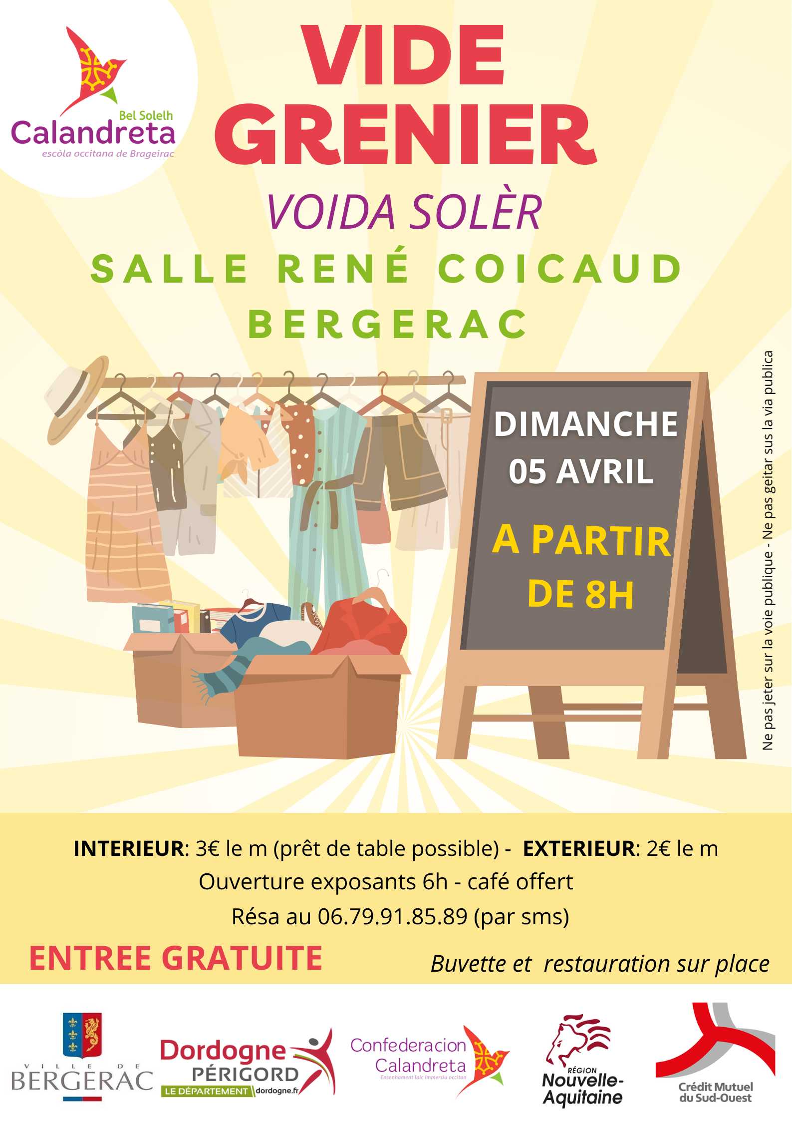 Vide-grenier intérieur (salle chauffée) et extérieur - buvette et restauration sur place. Pour les exposants : accueil à partir de 6h - inscription obligatoire par mail (escolacalandretabrageirac@gmail.com) ou par tel (06 79 91 85 89) - café offert - INTERIEUR : 3€/m (prêt de table possible ) - EXTERIEUR : 2€/m .