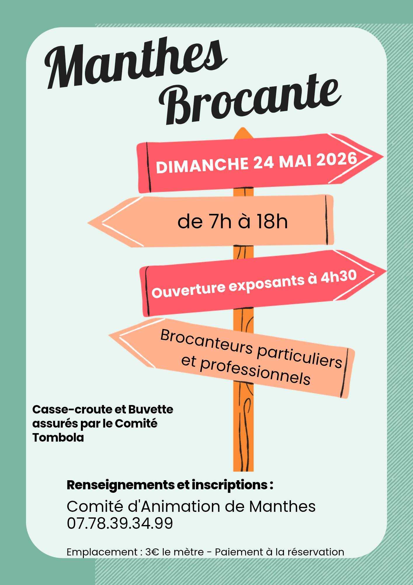 Dimanche 24 mai 2026 de 7h00 à 18h00 Le comité d‘Animation organise la 31ème Brocante PUCES ~ BROCANTE en plein air
