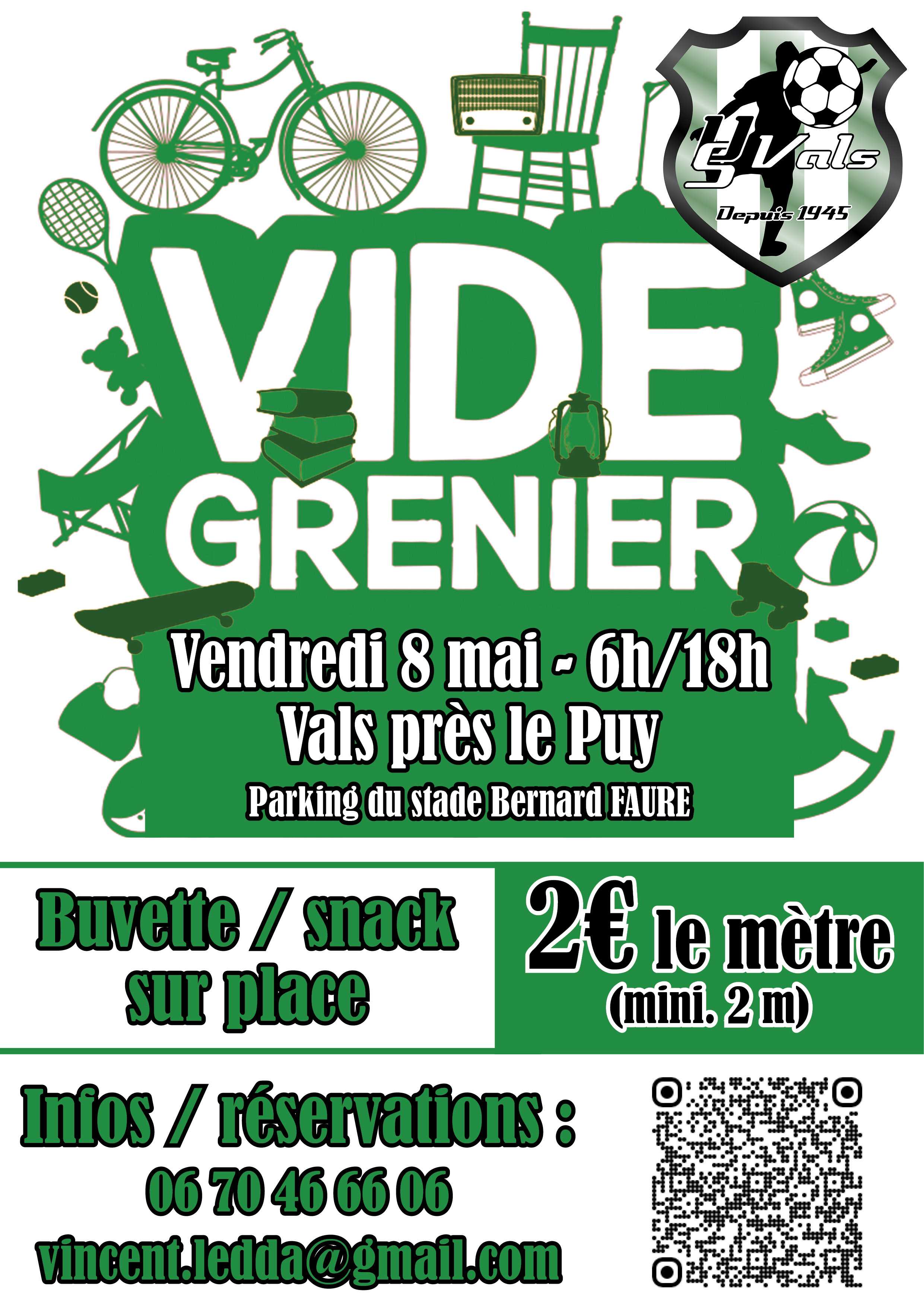Fort du succès des éditions précédentes, qui ont rassemblé plus de 100 exposants et attiré de très nombreux visiteurs, l’US Vals est heureux de vous annoncer le retour de son vide-grenier ! Rendez-vous le 8 mai 2026 de 6h à 18h sur les parkings du centre culturel et du stade Bernard FAURE de Vals-près-le-Puy. 2€ le mètre linéaire (2 mètres mini.) Café offert aux exposants Possibilité de mettre la voiture sur le stand (3 mètres mini.) Buvette / snack Infos : Vincent LEDDA - 06 70 46 66 06