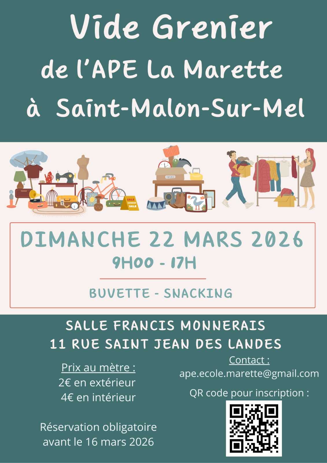 L'APE La Marette organise un vide grenier ainsi qu'une bourse aux vêtements 0-16ans à-50%. Cet événement est au profit du voyage scolaire des élèves de l'école. Pour toute inscription merci de scanner le QR code qui ce trouve sur l'affiche joint à cette événement. Merci à tous ceux qui s’inscriront ou viendront