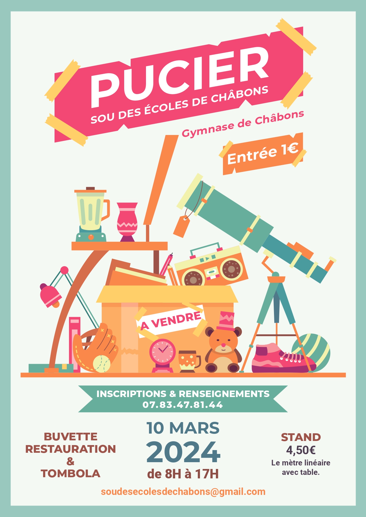 25ème pucier du Sou des Ecoles de Châbons 3 € le mètre linéaire sans table 4 € 50 le mètre linéaire avec table Buvette, restauration et tombola