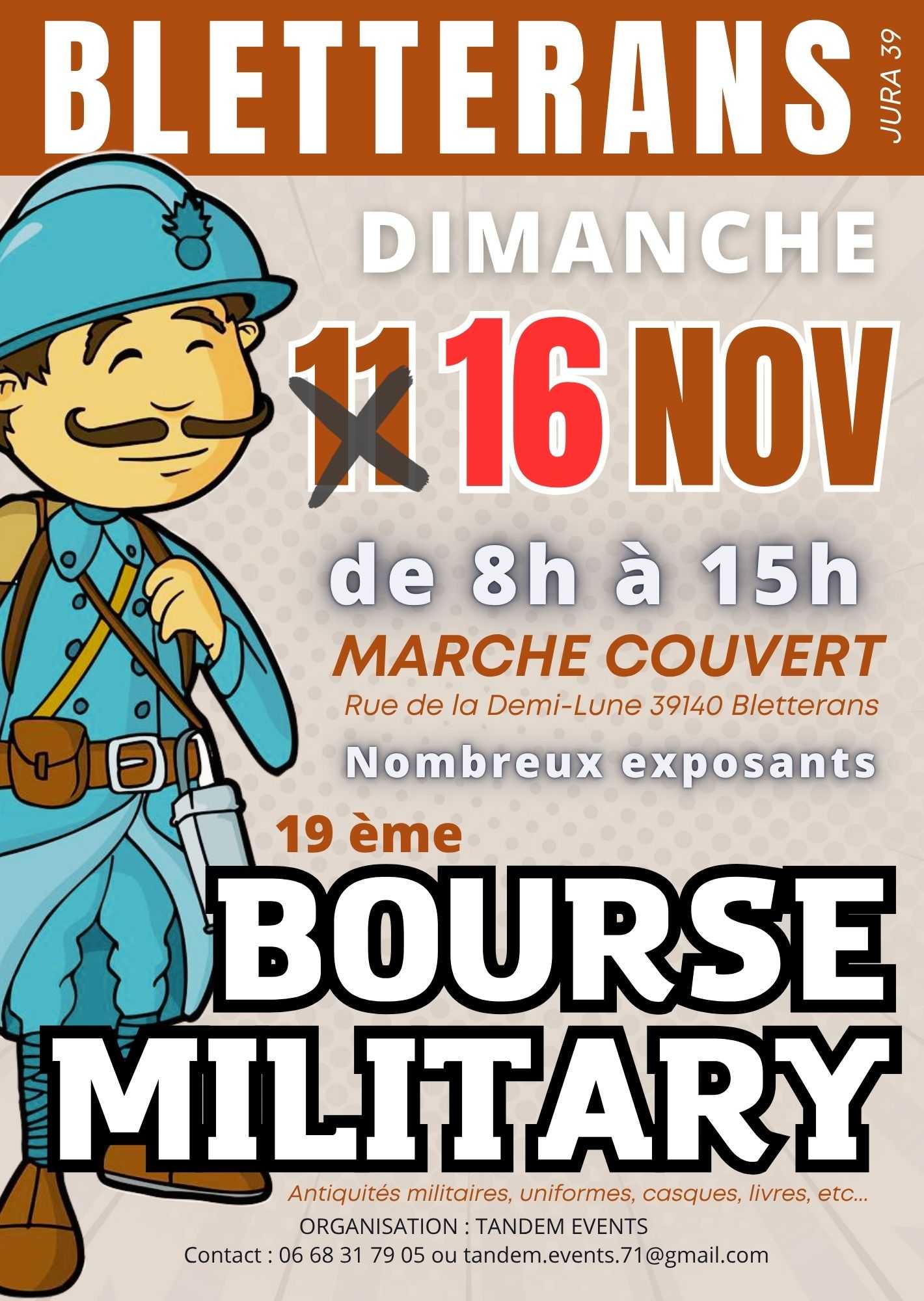 Ne manquez pas la 19ème édition... L’occasion de nourrir une passion au gré des acquisitions d’armes de collection, uniformes, casques, documents, insignes, livres, décorations, véhicules miniatures et autres petits objets sur le thème de l’armée, police et pompiers en présence d’une cinquantaine d’exposants. . Dimanche 16 NOVEMBRE 2025 BOURSE MILITARY De 8h à 15h . Marché couvert Rue demi-lune 39140 BLETTERANS . Entrée visiteurs : - 4 €uros (uniquement sur place) - GRATUIT pour les - 12 ans . PASS VIP - Accès avant ouverture officielle : 25 €uros Entrée déballage marchand - Donne accès avant l'ouverture officielle au public le dimanche de 6h à 15h. Achat billetterie uniquement sur weezevent https://my.weezevent.com/VIPBLETTERANS2025 . Organisation : TANDEM EVENTS Infoline : 06 68 31 79 05 Renseignements : tandem.events71@gmail.com . BUFFET - BUVETTE . Merci de partager l'évènement : https://www.facebook.com/events/1343494284116779/ . Bon Salon à Tous...