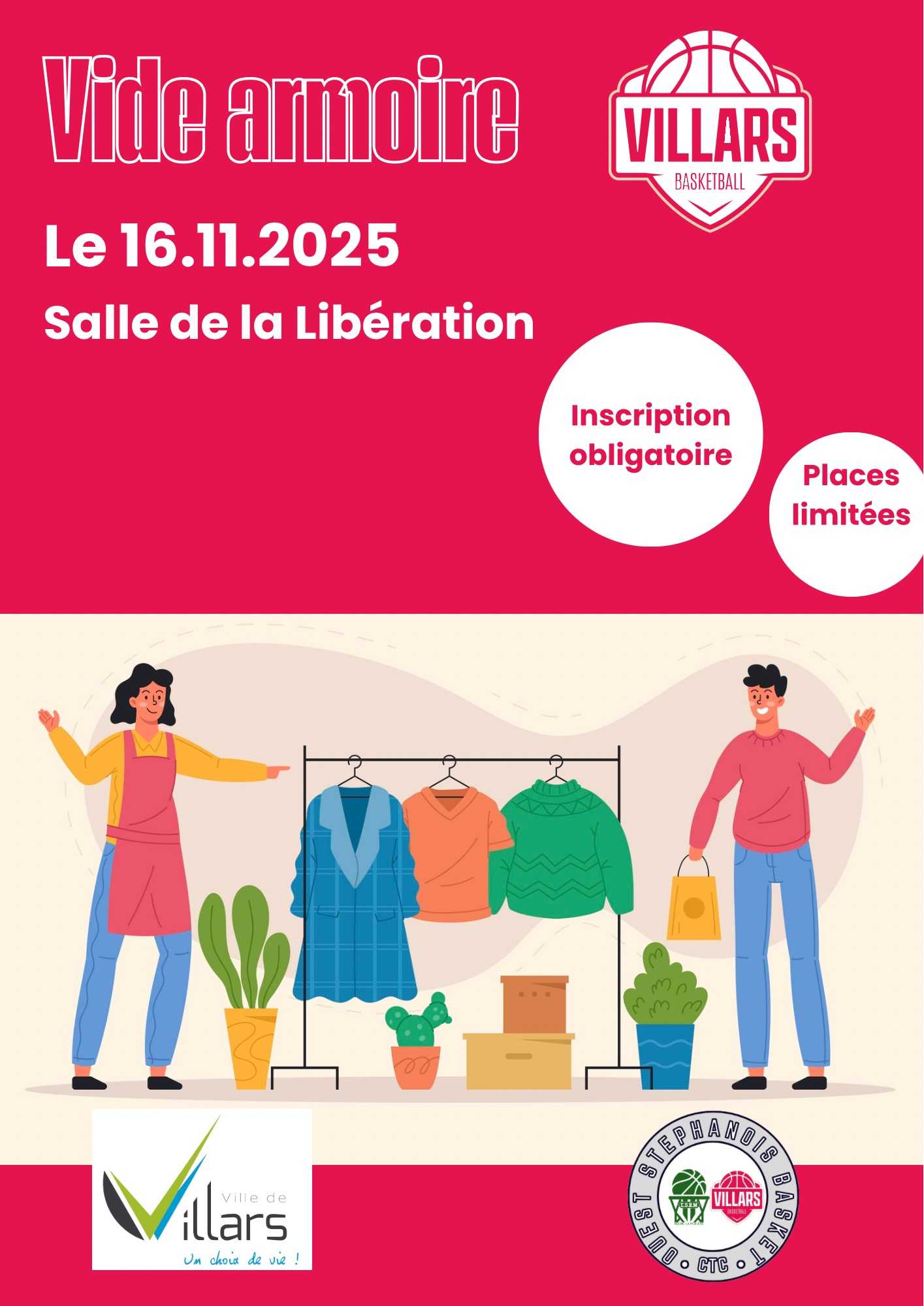 VIDE ARMOIRE organisé par le club de Villars Basket Vêtement homme/ femme/ enfant jeux, jouets, livres et petite puériculture ouverture au public de 9h à 14h bar et snacking sur place