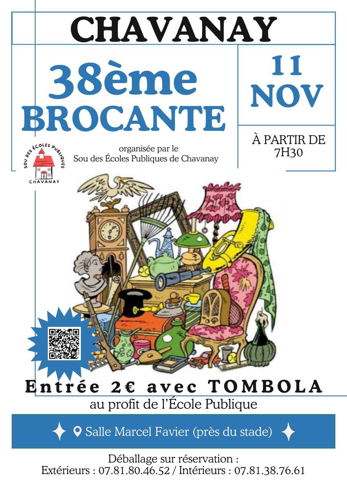 Informations visiteurs : 7h30-18h30 Venez nous rejoindre pour cette 38ème édition de la Brocante, organisée par le sou des écoles publiques de Chavanay. Vous pourrez visiter, en intérieur comme en extérieur, et profiter sur place d'une buvette et d'un stand de restauration. Votre entrée, au tarif de 2€, vous fera automatiquement participer à notre Grande Tombola, ainsi qu'au projets scolaires des écoles publiques de la ville. Nous vous en remercions. Informations exposants : dès 5h Venez exposer lors de notre 38ème édition de la Brocante de Chavanay, en intérieur (6€ le mètre linéaire) comme en extérieur (3€ le mètre linéaire). Vous trouverez toutes les informations nécessaires à l'inscription en contactant les organisateurs par téléphone et en prenant connaissance du bulletin qui vous sera transmis. Extérieures : 07 81 80 46 52 (200 exposants) Intérieures : 07 81 38 76 61 (100 exposants)