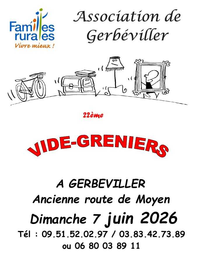 L’Association Familles Rurales organise son 22ème vide-greniers qui aura lieu le dimanche 7 juin 2026, à Gerbéviller, ancienne route de Moyen. De 6h à 8h, installation des exposants (tarif : 2,50€ le mètre) et vente jusqu’à 18h. Restauration sur place. Pour tous renseignements ou pour vous procurer un bulletin d'inscription : Tél. : 09 51 52 02 97 / 03 83 42 73 89 / 06 80 03 89 11 Site Internet : Familles Rurales Gerbéviller ou syl.serriere@laposte.net