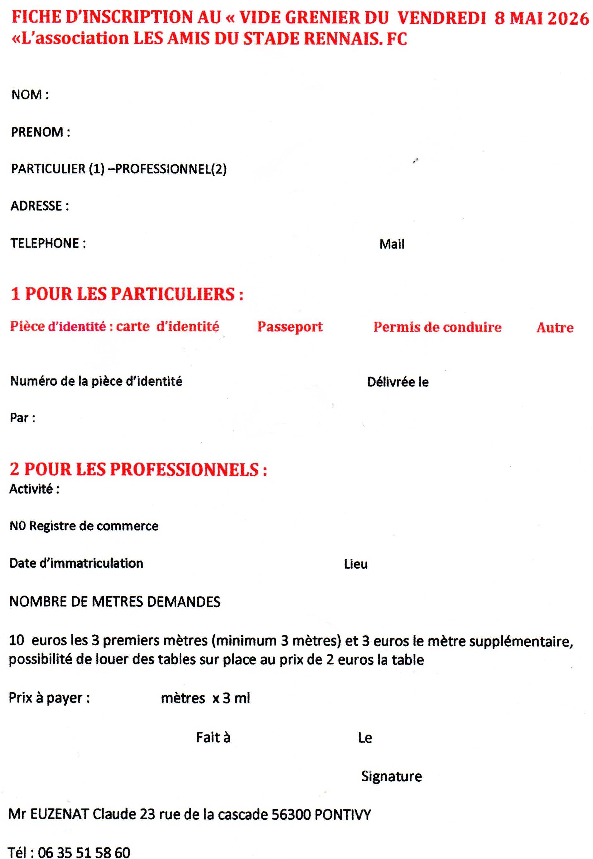 les amis du stade rennais organise leur 5 vide grenier annuel le Vendredi 8 Mai aux abords de la piscine découverte " appelée la plage " dans le cadre verdoyant jouxtant les rives du blavet tout proche du poumon vert. Une restauration sur place galette saucisse, frites, sandwichs et crêpes de froment à l'ancienne ainsi que des gâteaux , buvette .