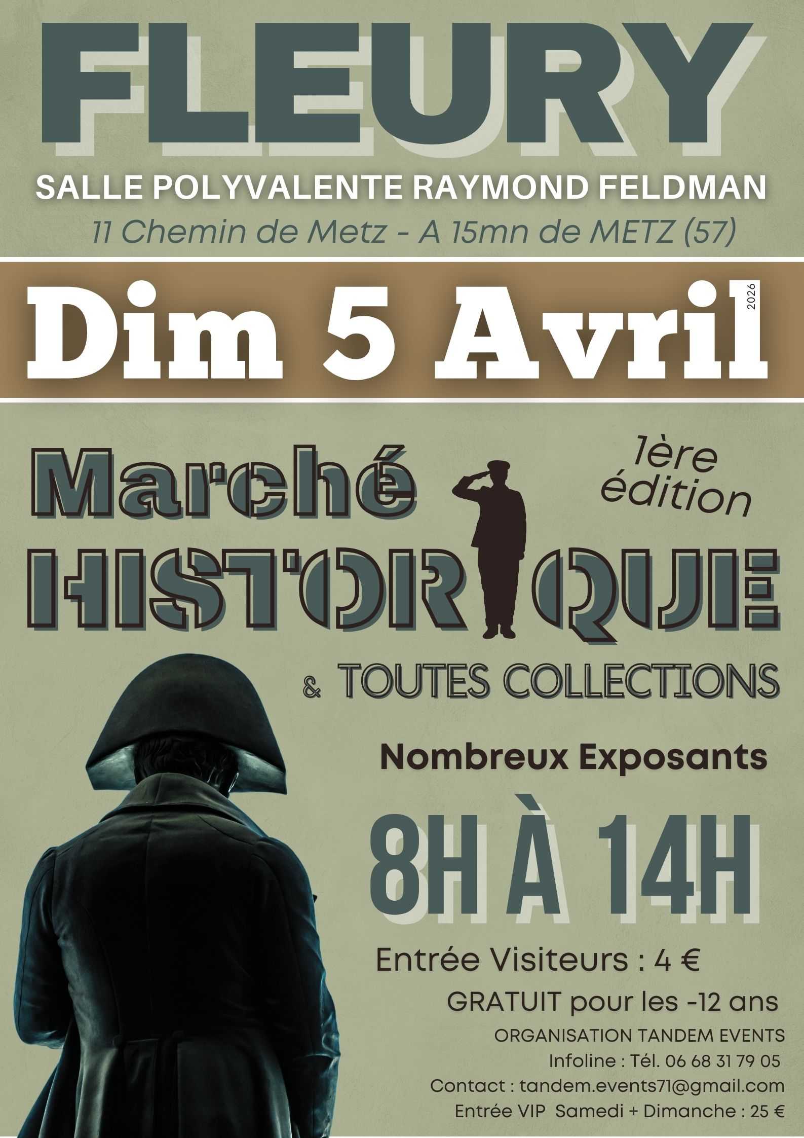 Ne manquez pas le 1er Marché Historique et Toutes Collections à la salle polyvalente Raymond Feldman de FLEURY (57- Moselle) le dimanche 5 Avril 2026 de 8h à 14h. . L’occasion de nourrir une passion sur le thème de l'antiquités militaire de l'époque Napoléon à la 2ème guerre mondiale au gré des acquisition d’armes de collection, uniformes, casques, insignes, livres, baïonnettes, figurines et autres petits objets sur le thème de l’armée, police et pompiers en présence d’une trentaine d’exposants. Les organisateurs permettront aux passionnés de découvrir l’objet idéal pour compléter leur collection personnelle ou simplement de revivre l’histoire des objets exposés. . Dimanche 5 Avril 2026 De 8h à 14h . Lieu : SALLE OMNISPORT RAYMOND FELDMAN 11 Chemin de Metz 57420 FLEURY (Moselle) . BILLETTERIES : - Tarif sur place : 4 €uros - GRATUIT pour les -12 ans - PASS VIP - Accès avant ouverture officielle : 25 €uros Entrée déballage marchand - Donne accès avant l'ouverture officielle au public pendant l'installation des exposants le samedi de 16h à 19h et dimanche de 6h30 à 14h Achat billetterie uniquement sur weezevent https://my.weezevent.com/VIPFLEURY2026 . Merci de partager l'évènement : https://www.facebook.com/events/746024904502602/ . Buvette et restauration sur place . Organisation : TANDEM EVENTS FRANCE tandem.events71@gmail.com Tél. 06 68 31 79 05 . Bon Salon à Tous...