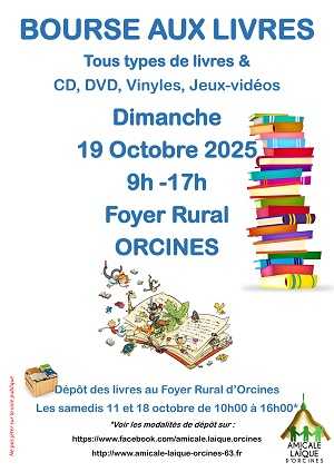 Vous venez déposer vos livres, les samedis 11 et 18 Octobre 2025, par liste de 20 articles (livres, ou cd/dvd/vinyles) avec le prix souhaité de vente. On s'occupe de les étiqueter, les trier par catégorie et les mettre en vente sur la journée du Dimanche 19 Octobre 2025. Le soir, vous venez récupérer votre argent et les invendus. Si vous le souhaitez, vous pouvez faire don de vos invendus à l'amicale laïque dont l'un des objectifs est d'aider l'école publique dans la réalisation de ses projets avec les enfants. Vous trouverez le fonctionnement complet et le document avec les listes vierges : http://www.amicale-laique-orcines-63.fr/ Vous pouvez d'ores et déjà préparer vos listes de livres en téléchargeant les deux fichiers ci-dessous. https://www.facebook.com/amicale.laique.orcines amicale.laique.orcines@gmail.com