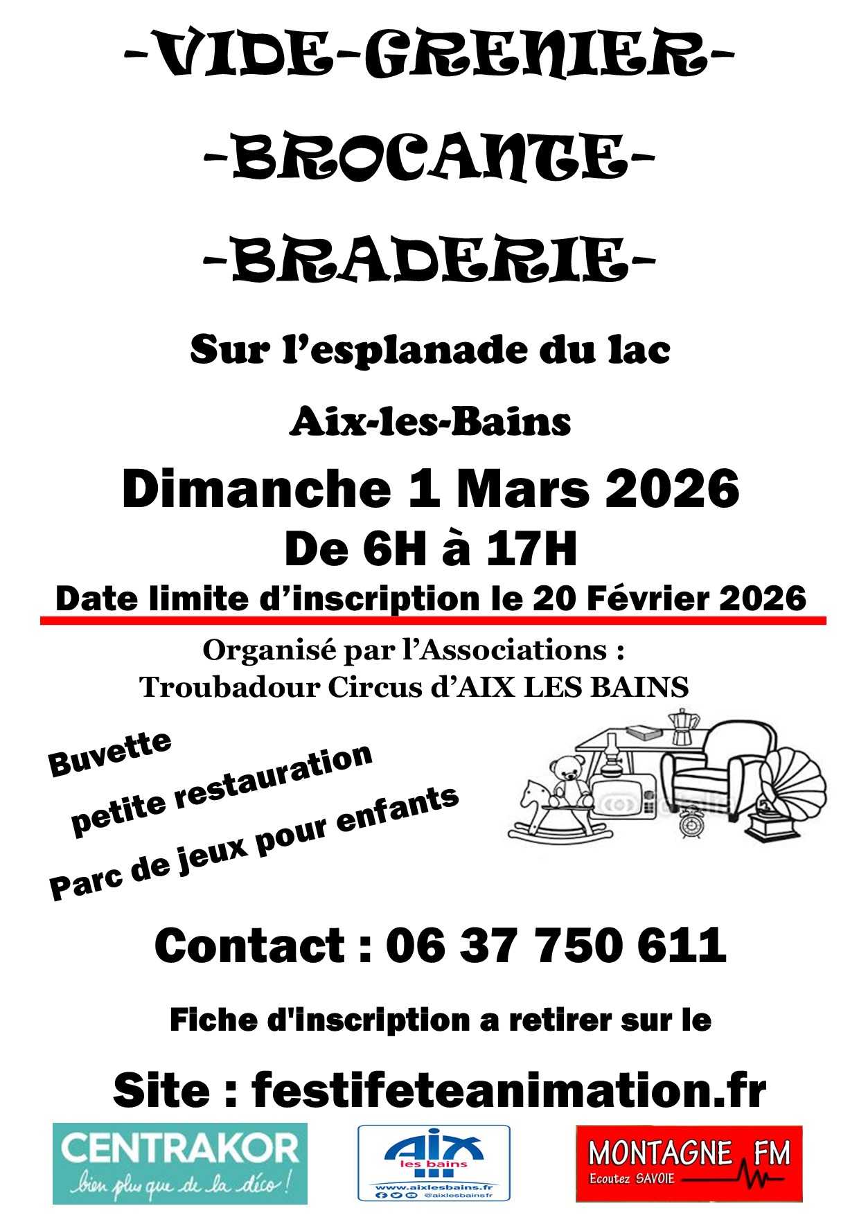 l'association troubadour Circus organise sont vide grenier, brocante, braderie le dimanche 1er Mars 5 € le mètre 4 mètre minimum feuille d'inscription a retirer sur notre site ( festifeteanimation.fr )