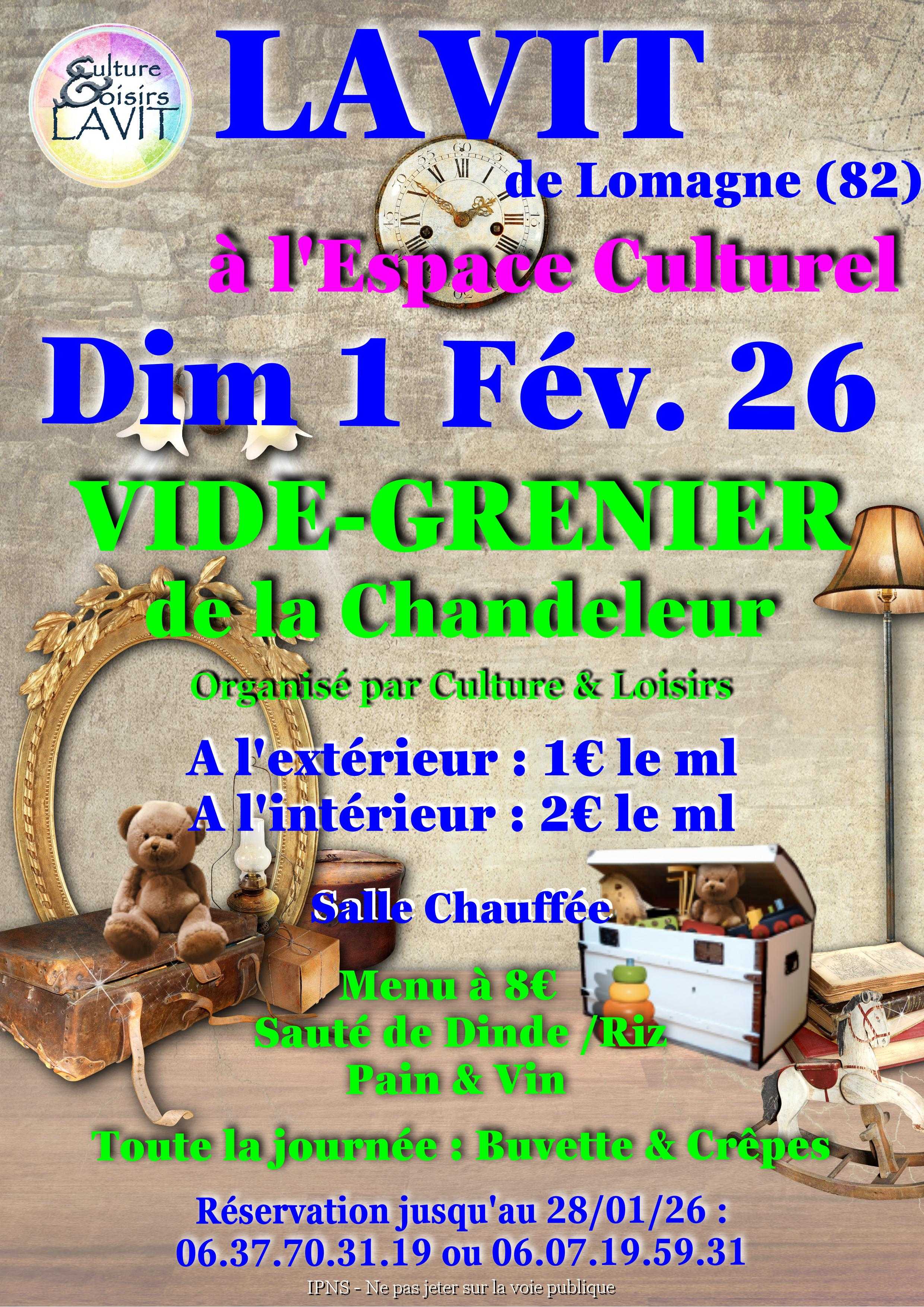 Vide-greniers en intérieur (salle chauffée) à 2 € le ml et en extérieur (sur le parking photovoltaïque) à 1 € le ml