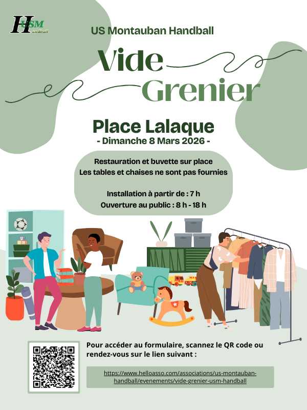 Une première pour l'USM handball : un vide grenier ! Le club de handball de Montauban a à cœur de maintenir les encadrements de nos jeunes sportifs de qualité et d'offrir des temps de festivité à nos adhérents. Pour cela, les bénévoles et salariés essaient de multiplier les actions qui peuvent y contribuer. Que vous soyez des habitués des vide greniers ou que vous vous lanciez, votre participation soutiendra notre association. Sportivement, Une buvette sera sur place (possible menu pour le midi). Nous nous donnerons rendez-vous dès 7h pour l'installation pour une ouverture au public de 8h à 17h. Pour accéder au formulaire, rendez-vous sur le lien suivant : https://www.helloasso.com/associations/us-montauban-handball/evenements/vide-grenier-usm-handball