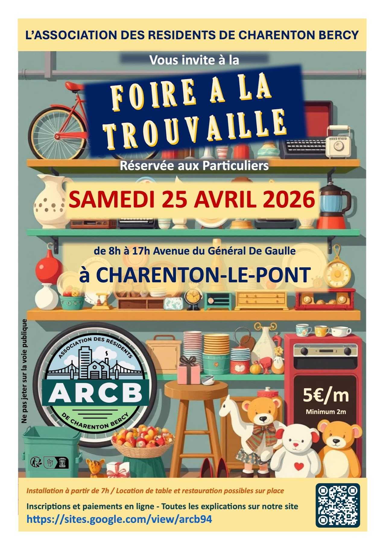 En ce début de printemps, l’ARCB ouvre la saison des vide-greniers de Charenton le Pont avec sa Foire à la Trouvaille. Venez nombreux offrir une seconde vie à vos objets ou en dénicher de nouveaux, uniques, vintage ou de collection… Entrée gratuite pour les visiteurs ! Partagez l’information autour de vous et à très vite !