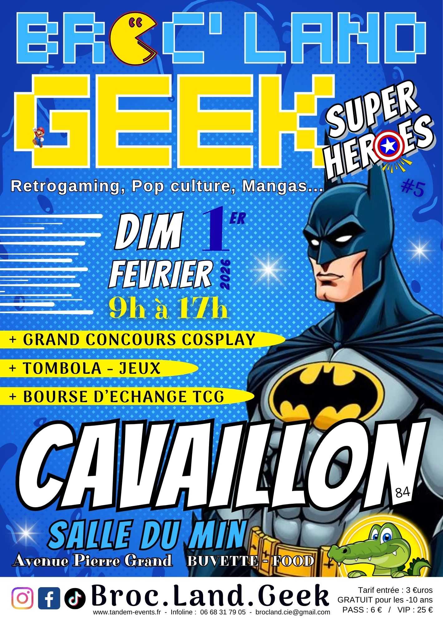 Ne manquez pas l'Evènement BROC' LAND GEEK - CAVAILLON 2026 le dimanche 1er FEVRIER 2026... . Durant cette journée, ce salon rassemble de nombreux exposants venus de toute la région et des régions limitrophes sur une surface de 1000 m², dont l’objectif est de vendre, d’échanger ou de partager leur passion : Jeux vidéo, pop culture, jouets vintage, lego, playmo, univers steampunk, jeux de rôle, héros, fantasy, sciences fiction, monde imaginaire, figurines, mangas, consoles de salon, miniatures, skylanders, illustrations, décoration, cartes à jouer, pet-shop, comics, bandes dessinées, jeux de société, livres de SF, Fantastique, dvd, films cultes, jeux de cartes, goodies de séries TV actuelles et rétro, etc... . Lieu : SALLE DU MIN Avenue Pierre Grand 84 300 CAVAILLON . Horaires : 9h - 17h . NOMBREUSES ANIMATIONS : . *** GRAND CONCOURS LIKE MY COSPLAY *** Chaque candidat inscrit avant le 29 Janvier 2026 recevra une invitation au BLG et devra récolter dans les allées du salon un maximum de likes. Le vote du public et uniquement le vote du public sera pris en compte par le nombre de mentions "J'aime" via un QR CODE (afficher sur le salon). Le grand gagnant sera annoncé le dimanche à 16h et remportera un trophée et un bon d'achat de 100 euros à dépenser au salon. Formulaire d'inscription pour les cosplays : https://forms.gle/aSSUHpWT2v4XXQyi8 Lien du concours facebook : https://www.facebook.com/events/1611529240225771 . *** JEU CONCOURS PASS*** Avec ton Pass Coupe file participe au Jeu-concours et tu auras peut-être la chance de gagner 1 console de jeu rétrogaming... - Tirage au sort à 16h30 - Achat billetterie uniquement sur weezevent : https://my.weezevent.com/CAVAILLON2026 Si absent lors du tirage, le lot vous sera envoyé en colis suivi. . *** COMBAT DES BLASONS *** Choisis ton blason en arrivant sur le site du BLG avec ton téléphone portable et accomplis des défis, quêtes et épreuves pour gagner des points de prestige... Le blason ayant accumulé de plus de points le dimanche à 16h sera proclamé vainqueur du tournoi des Blasons. . *** BOURSE D'ECHANGE TCG (Trading Card Game) *** Ce sera l'occasion parfaite de partager, compléter votre collection et rencontrer d'autres passionnés dans un espace dédié aux cartes : Pokémon - Dragon Ball - One Piece - Lorcana - Yu Gi Oh - Magic - Altered - Etc... . BUFFET - BUVETTE . BILLETTERIE SUR PLACE : 3 €uros GRATUIT pour les -10 ans et PMR . PRE-VENTE PASS COUPE FILE + JEU CONCOURS : 4 €uros "Offre jusqu'au 1er Janvier 2026" Entrée sans file d'attente et participe au Jeu-concours pour gagner 1 display. Achat billetterie uniquement sur weezevent https://my.weezevent.com/CAVAILLON2026 . PASS COUPE FILE + JEU CONCOURS : 6 €uros Entrée sans file d'attente et participe au Jeu-concours pour gagner 1 console de jeu rétrogaming. Achat billetterie uniquement sur weezevent https://my.weezevent.com/CAVAILLON2026 . PASS COUPE FILE FAMILY + JEU CONCOURS : 20 €uros 2 adultes + 2 enfants Entrée sans file d'attente et participe au Jeu-concours pour gagner 1 console de jeu rétrogaming. Achat billetterie uniquement sur weezevent https://my.weezevent.com/CAVAILLON2026 . PASS CULTURE Tarif Pass Coupe file : 6 €uros Entrée sans file d'attente Réservations "Duo" acceptées https://passculture.app/offre/369664055 . PASS VIP - Accès avant ouverture officielle : 25 €uros Entrée déballage marchand - Donne accès avant l'ouverture officielle au public pendant l'installation des exposants le samedi de 16h à 19h et dimanche de 7h à 17h Achat billetterie uniquement sur weezevent https://my.weezevent.com/CAVAILLON2026 . Organisation : Tandem Events France https://www.tandem-events.fr/ . Renseignements : brocland.cie@gmail.com Infoline : 06 68 31 79 05 . *** INSCRIPTION EXPOSANTS *** Demande via formulaire : https://forms.gle/sXcyFn4FDHisPera9 Contact Nathalie : commercial.tandem.events@gmail.com . Merci de partager l'évènement : https://www.facebook.com/events/1240568494571712/ . Bon Salon à Tous...