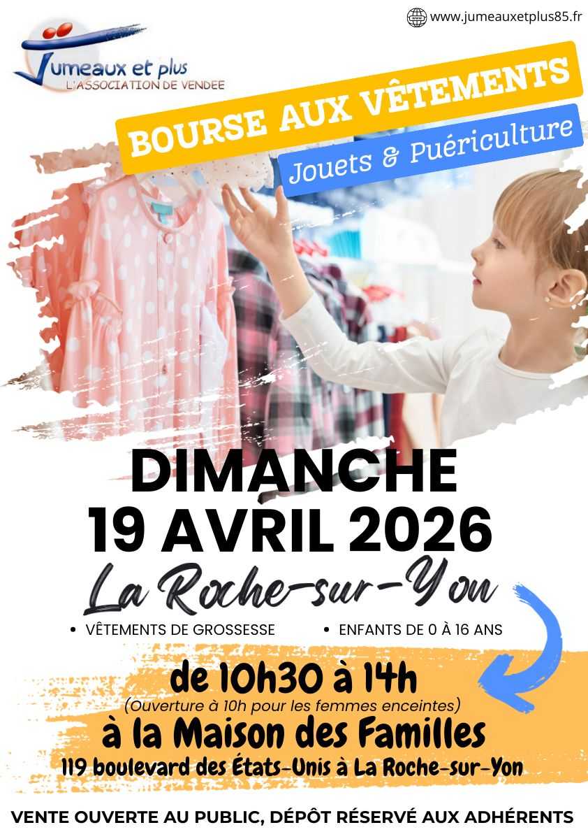 L'association Jumeaux et plus 85 a le plaisir d'organiser sa traditionnelle bourse de l'enfance le 19/04/26 : - vêtements de grossesse - vêtements de la naissance à 16 ans - puériculture - jeux, jouets - livres - décoration Vente en continu de 10h30 à 14h. Ouverture des portes dès 10h pour les femmes enceintes. La vente est ouverte à tout public, mais les dépôts sont réservés aux adhérents de l'association.