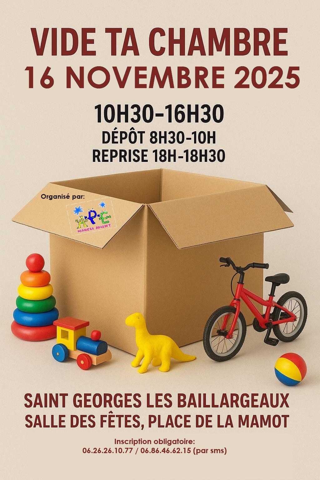 L'APE Marcel Jolliet organise un Vide Ta Chambre au profit des écoles de St-Georges-Lès-Baillargeaux. Le 16 novembre 2025 à la salle des fêtes de la Mamot 86130 Saint-Georges-Lès-Baillargeaux Vente de Jouets, jeux, livres, vélo, déguisements, trottinettes en bon état et complets. 2€/liste (20 articles _ uniquement des prix ronds) Dépôt le 16/11/2025 de 8h30 à 10h Vente le 16/11/2025 de 10h30 à 16h30 Reprise des invendus le 16/11/2025 de 18h à 18h30 Inscription obligatoire au 06.26.26.10.77 ou au 06.86.46.62.15 https://www.facebook.com/APEMarcelJolliet