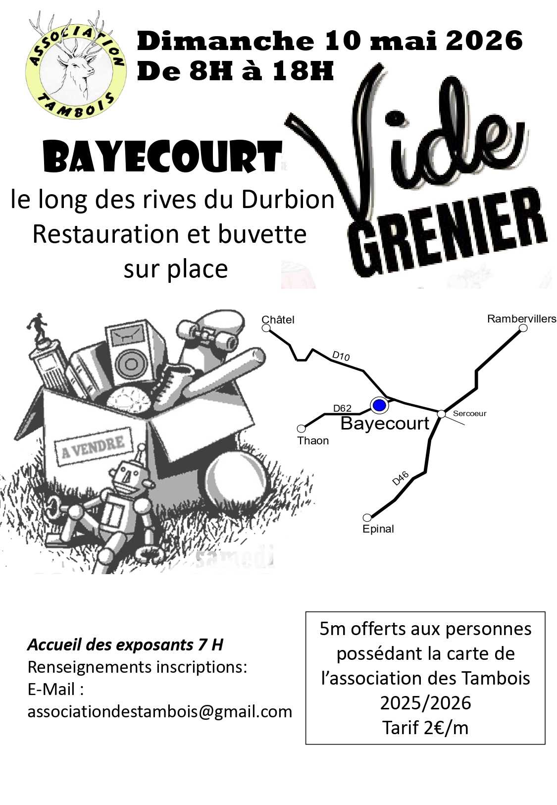 Vide grenier du 10 mai 2026 organisé par l'association des Tambois de Bayecourt // réservation avant le 8 mai : 2€/m // jour j : 3€/m // personnes possédant la carte de l’association des Tambois 2025/2026 = 5m offerts // buvette et restauration sur place // accueil des exposants à 7h